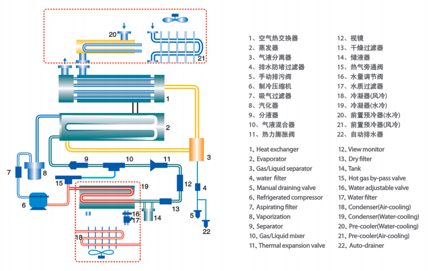 壓縮空氣首先進(jìn)入預(yù)冷卻器(20、21)進(jìn)行初步冷卻,再引入氣對氣熱交換器(回?zé)崞? (1) ,由冷卻的排出空氣進(jìn)一步降溫,并將冷凝出的水排出機(jī)外。然后流入氣對制冷劑的熱交換器(蒸發(fā)器) (2) ,由制冷系統(tǒng)進(jìn)一步冷卻。